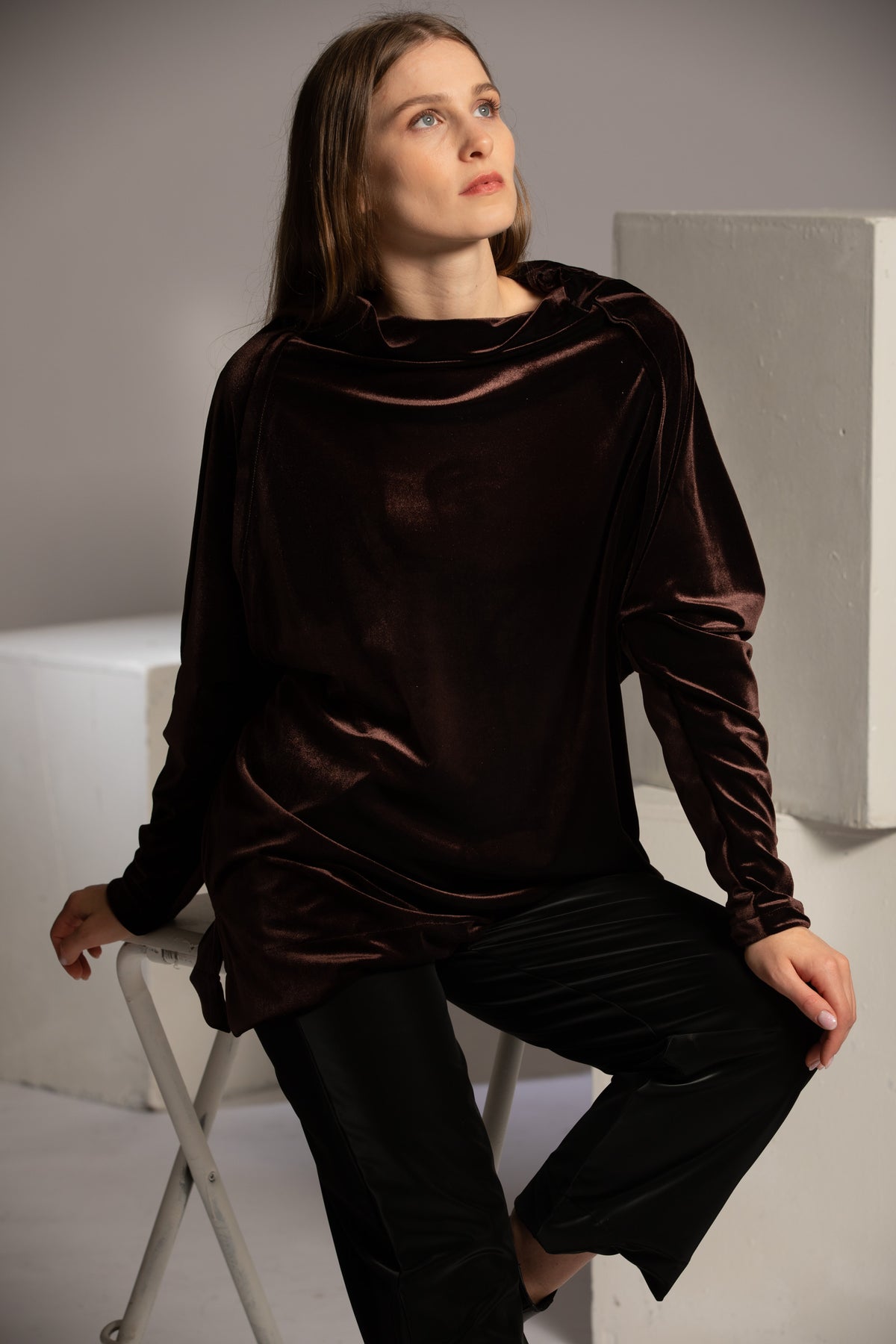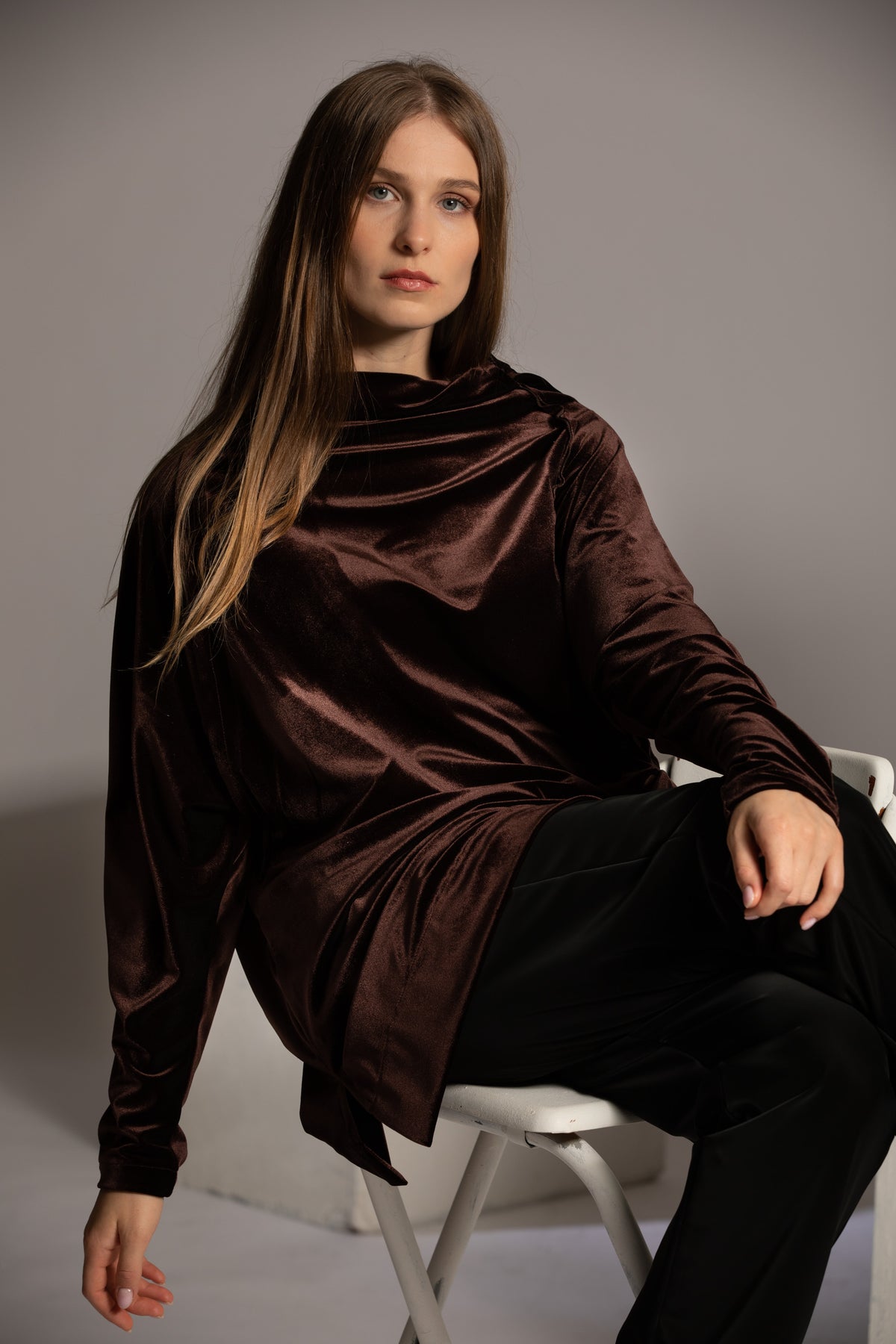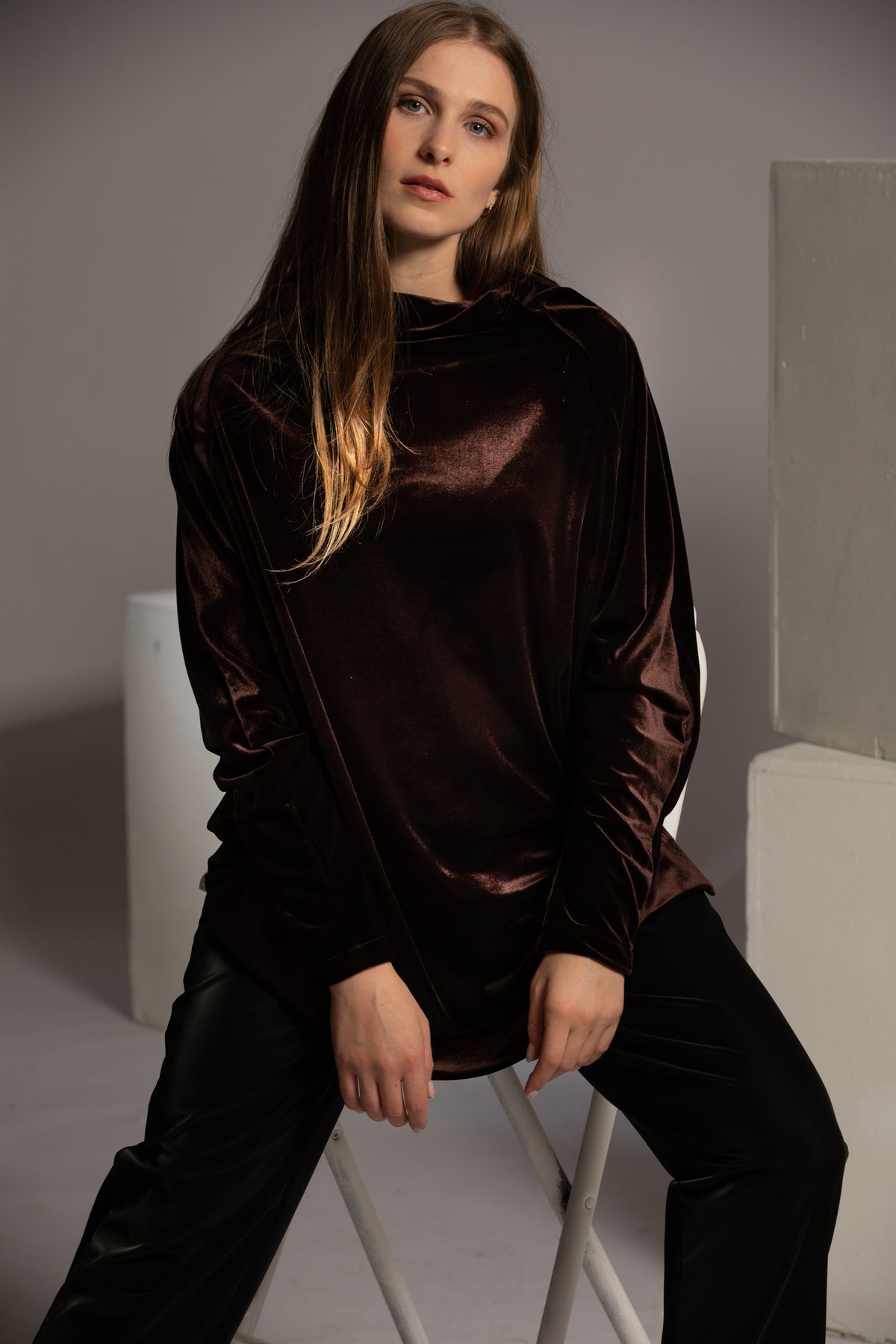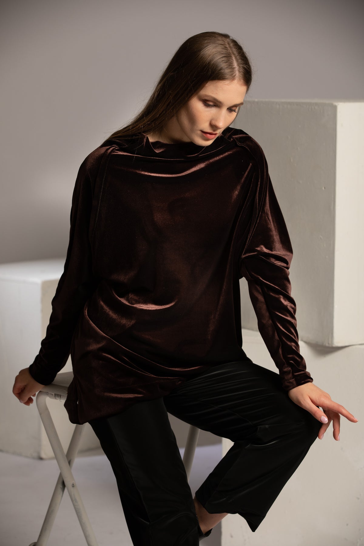חולצת קטיפה בצבע חום/בורדו, עם אלכסון רגל בכתף, צווארון גולף רחב