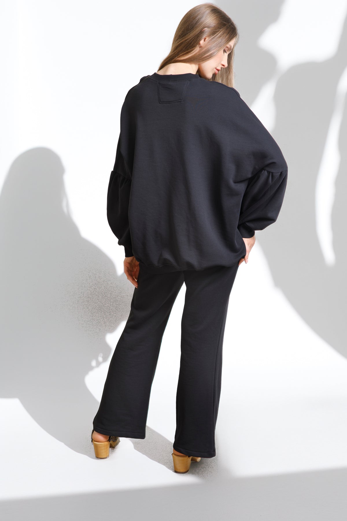 מכנס פוטר גזרה גבוהה, גומי במותן. רקמת פרח עדינה ליד קרסול בצד אחד