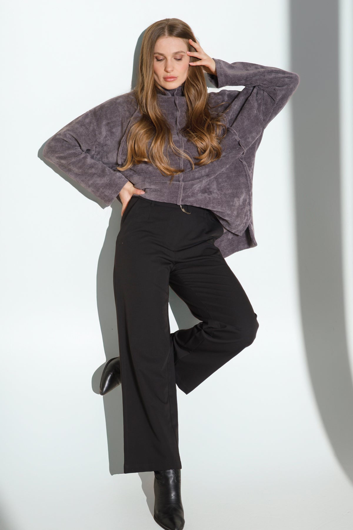 סוודר פנדי בצבע אפור, עם טקסטורה עדינה, צווארון גולף רחב ,