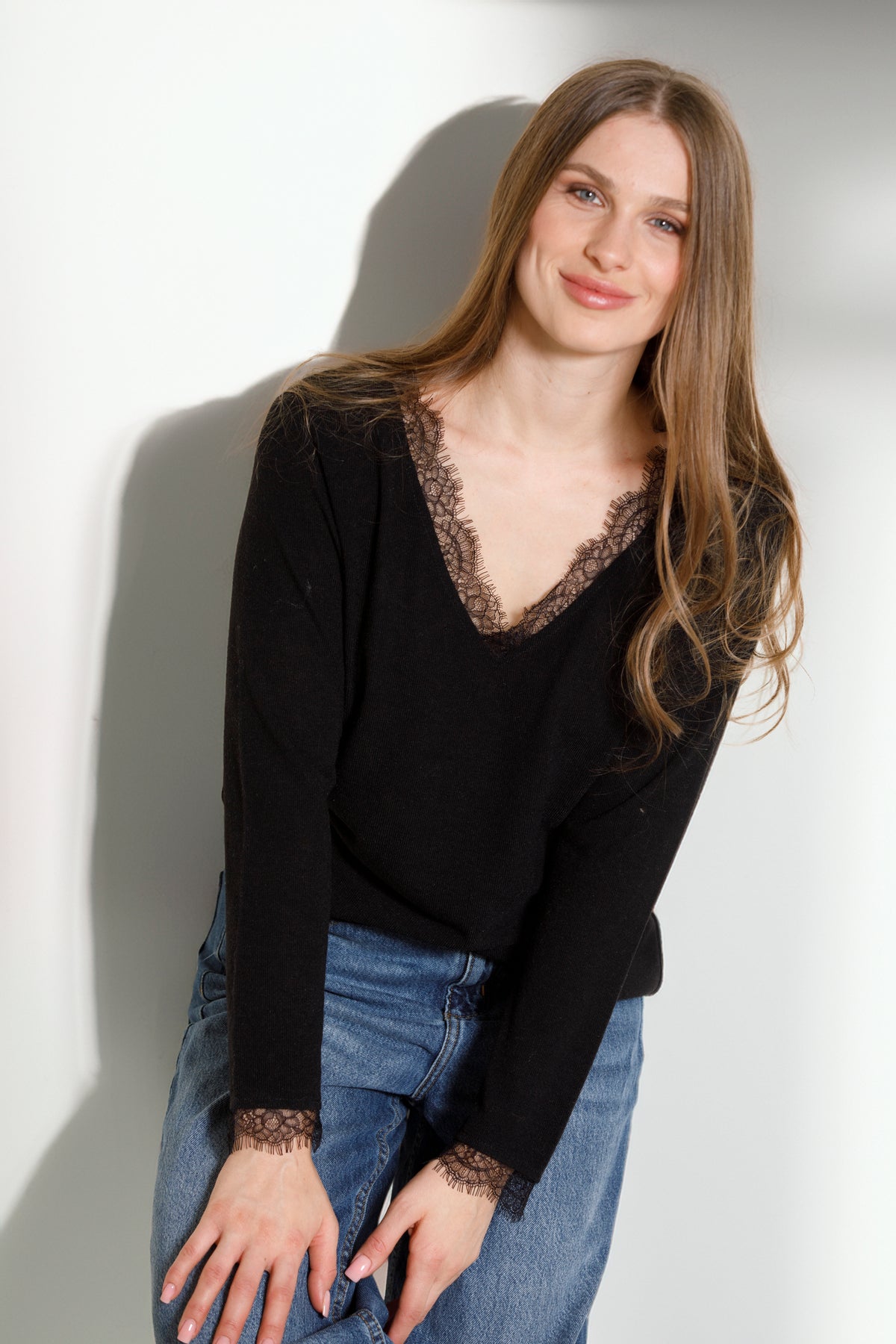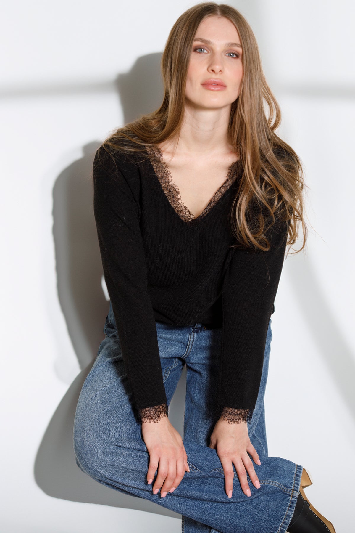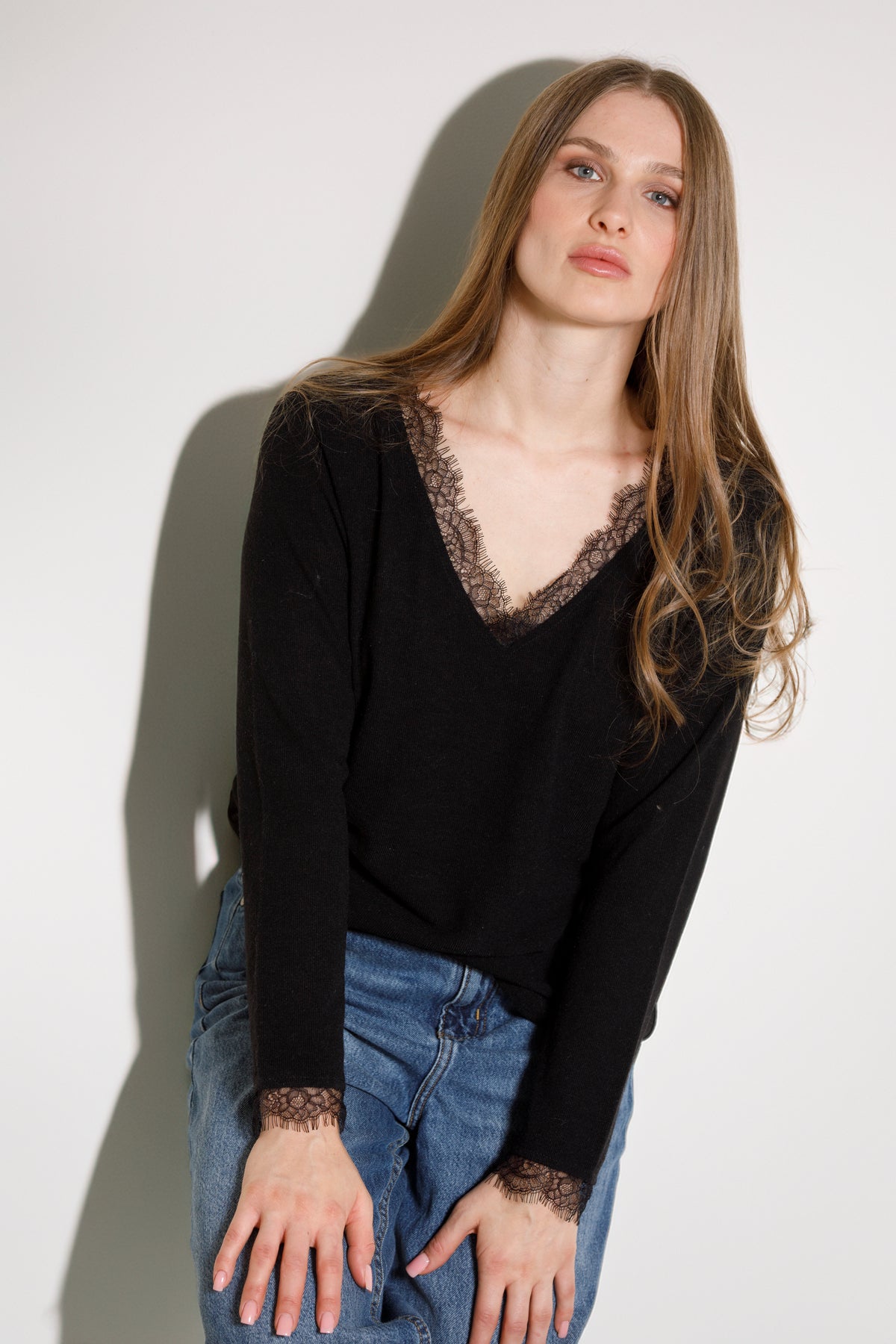 סוודר עם מחשוף וי עמוק מתחרה, מבד ג'רסי רך