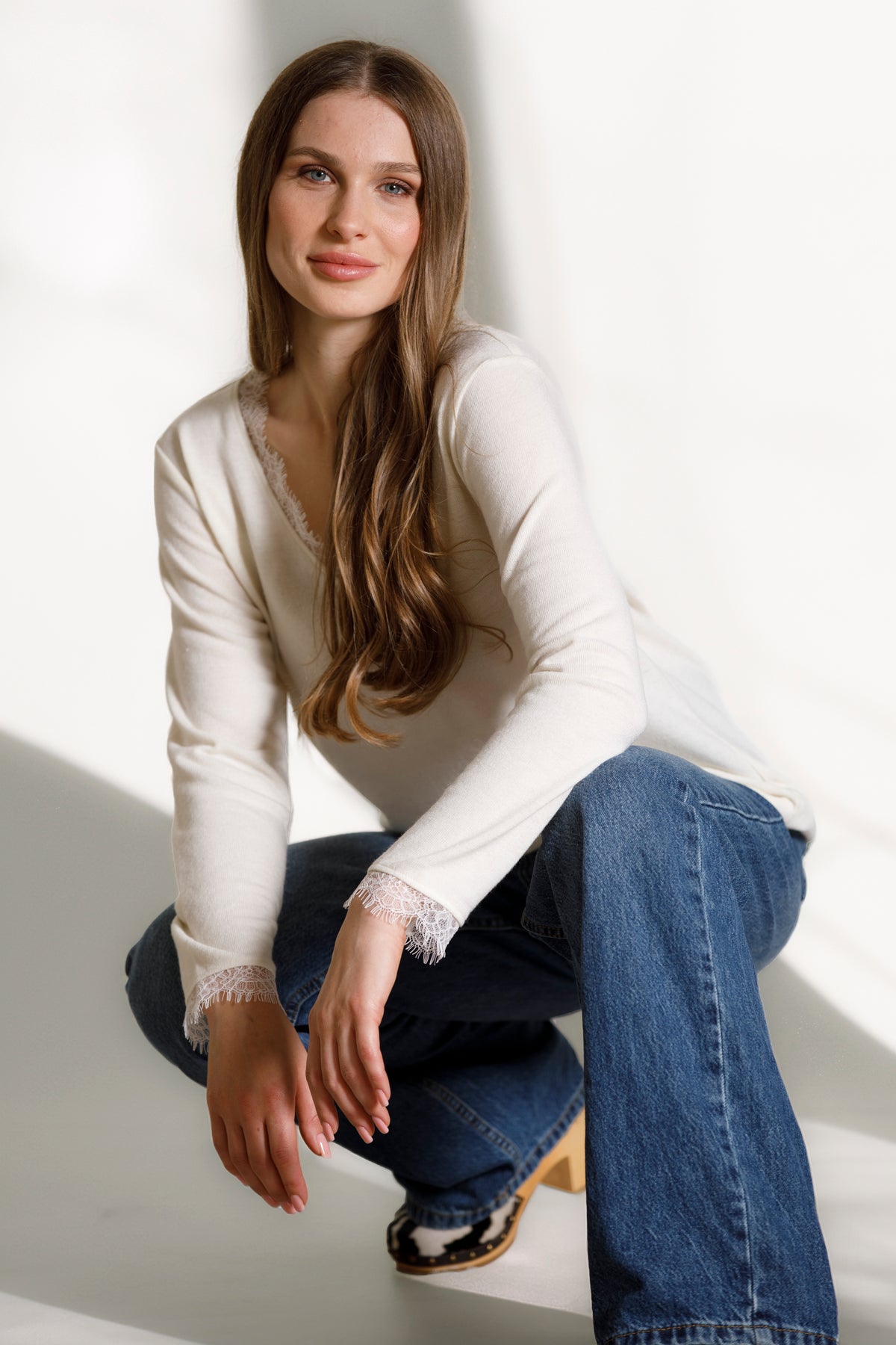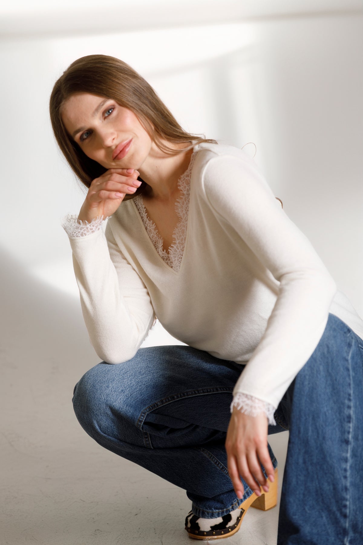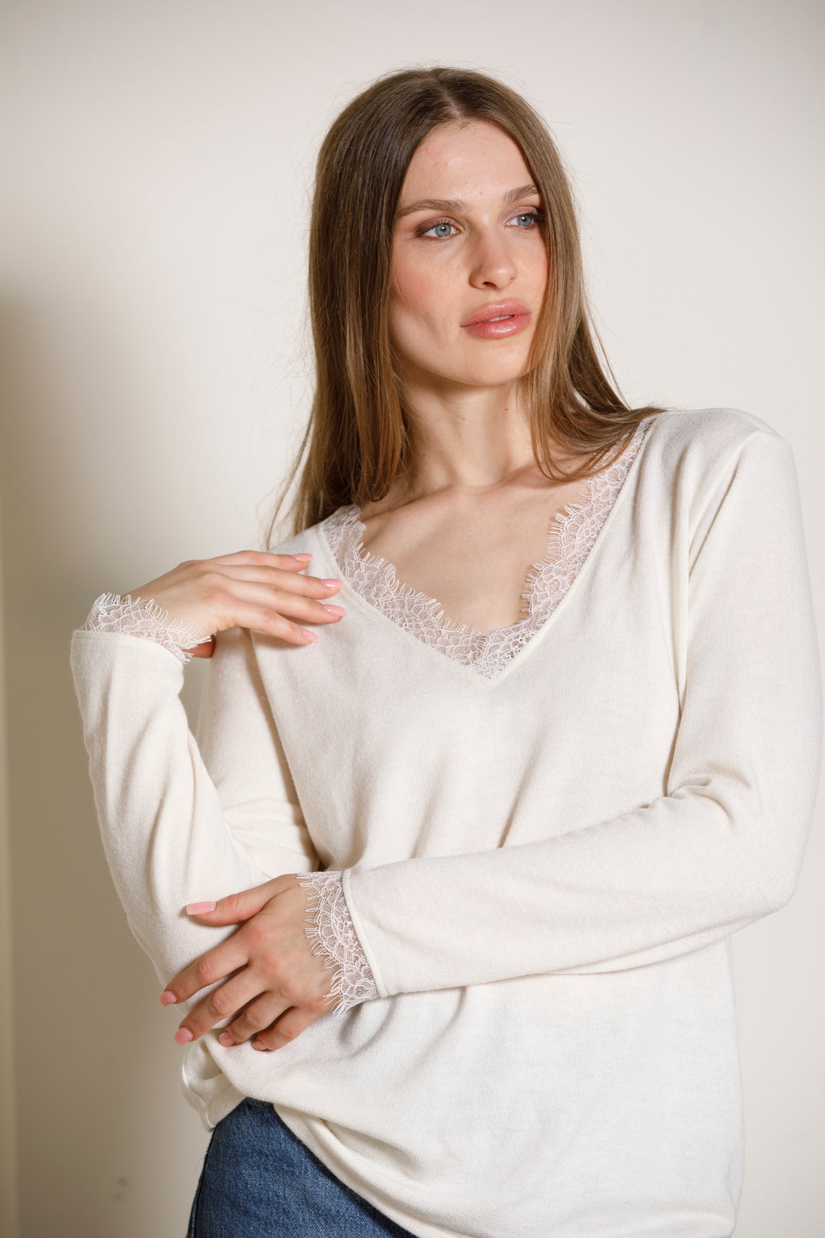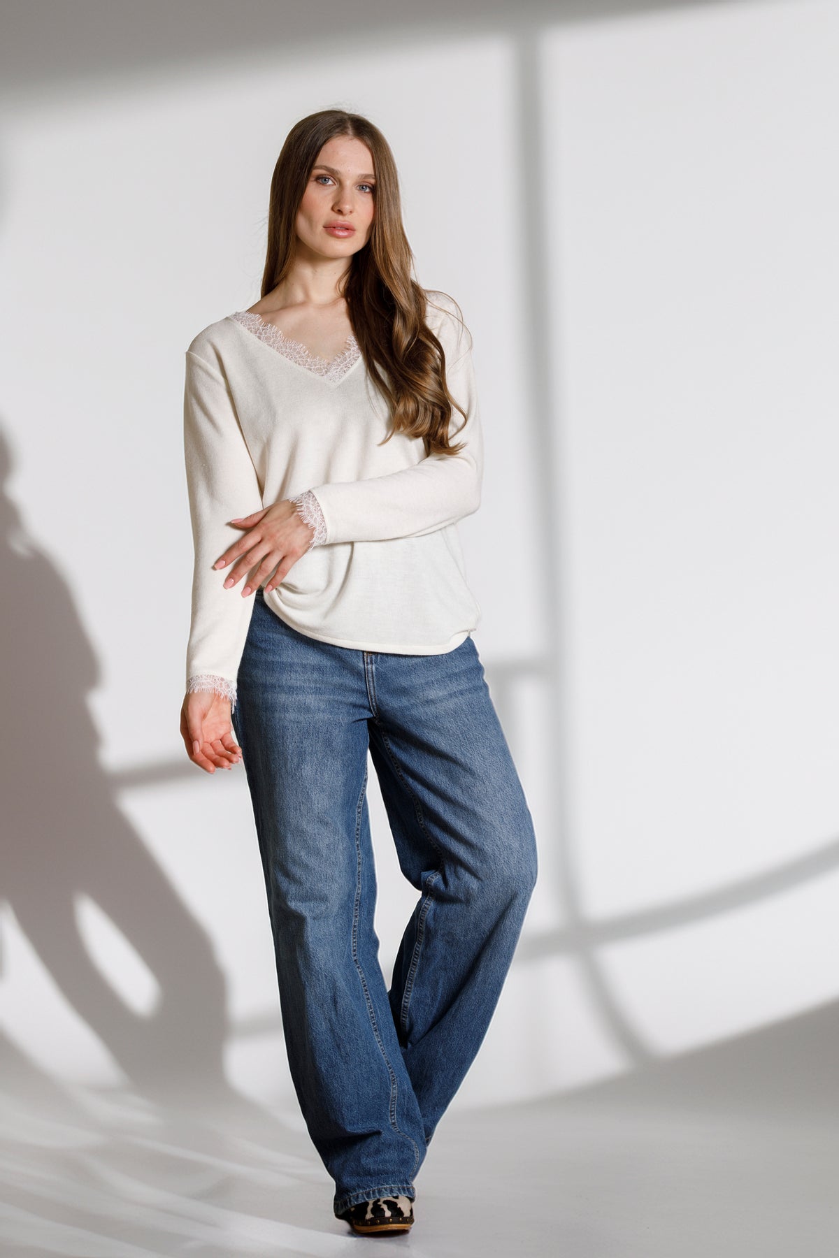סוודר עם מחשוף וי עמוק מתחרה, מבד ג'רסי רך